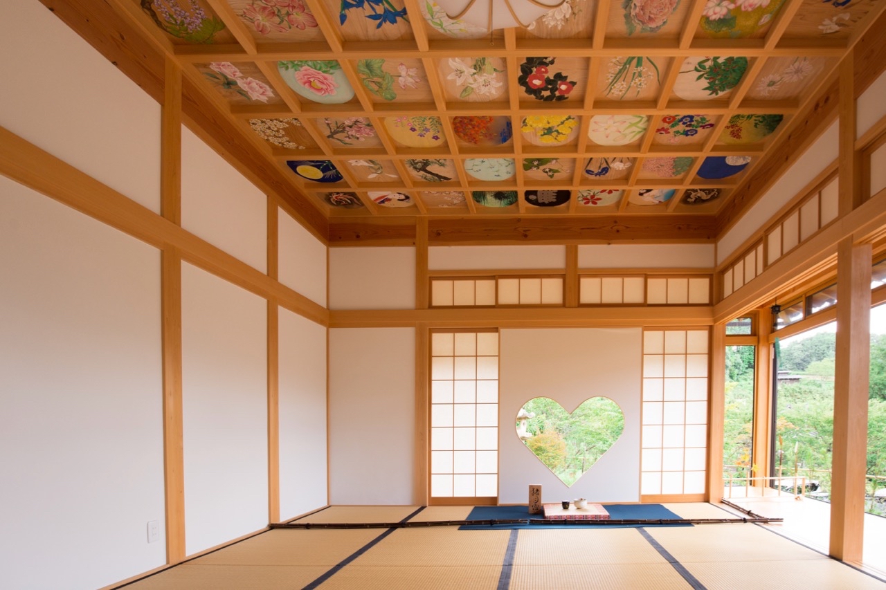 その結果、風鈴まつり最終日を満喫できた。たまに強い風が吹くと、一斉に音を奏でる無数の風鈴。風が止んだときにはサッと静まり返り、その対比がとてもおもしろかった。台風の影響で、拝観者はおそらく普段よりもかなり少なかったのではないだろうか。猪目窓や天井絵のある「則天の間」でも、ほぼ写真が取り放題だった。