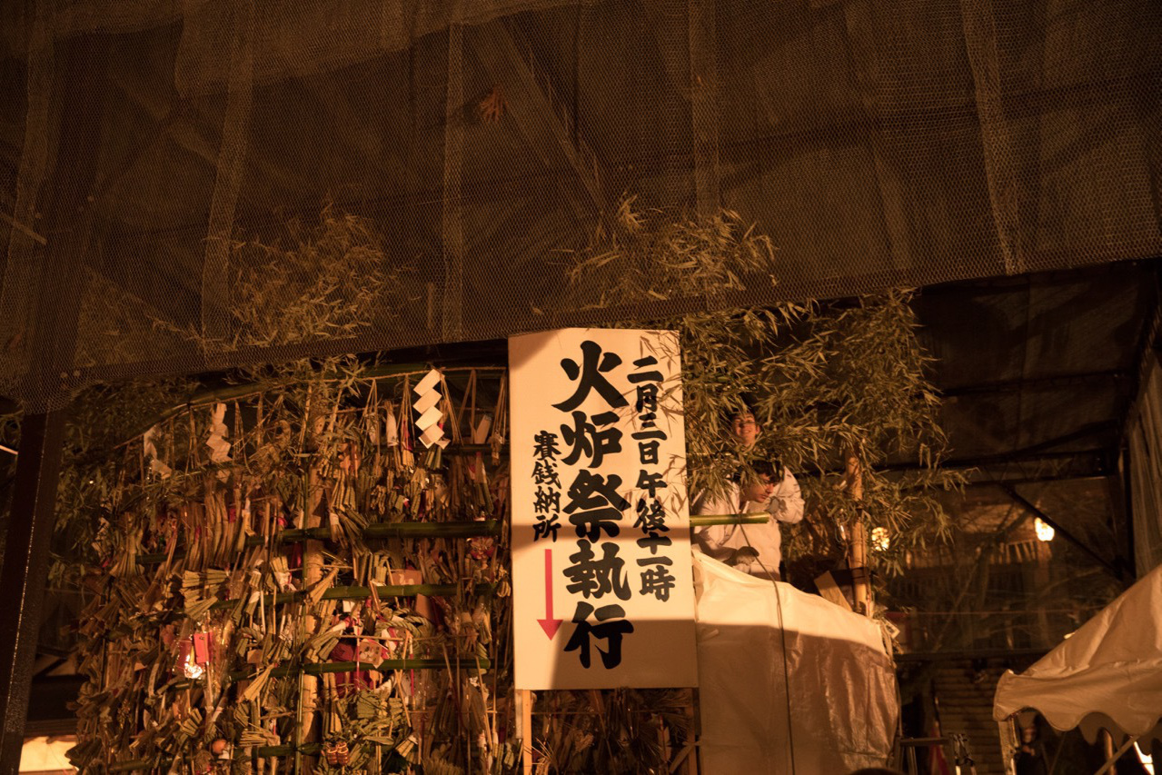 火炉祭は吉田神社節分祭のクライマックスで、納められた古神符守札に宿る神霊が元の御座にお還りになられる様に、浄火を点じ焼き納める儀式である。火炉は直径4mほど、高さも4mほどありそうな巨大な円柱形をしている。
